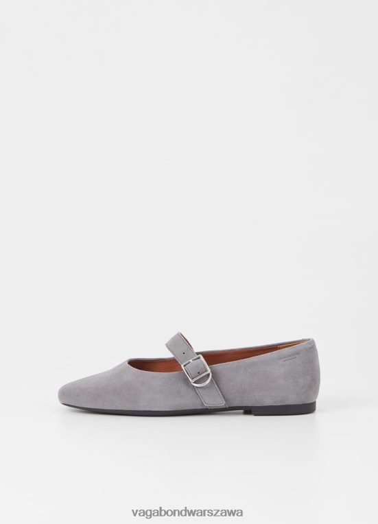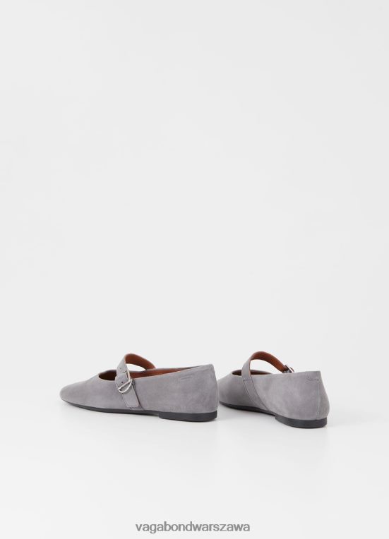 jolin To Eleganckie Płaskie Buty Mary Jane O Wyrafinowanym Wyglądzie. Styl Jest Wykonany Z Szarego Zamszu Z Zaokrąglonymi Noskami I Regulowanym Paskiem Na Kostkę Ze Srebrną Klamrą. Niskie Obcasy Mają 11 Mm.